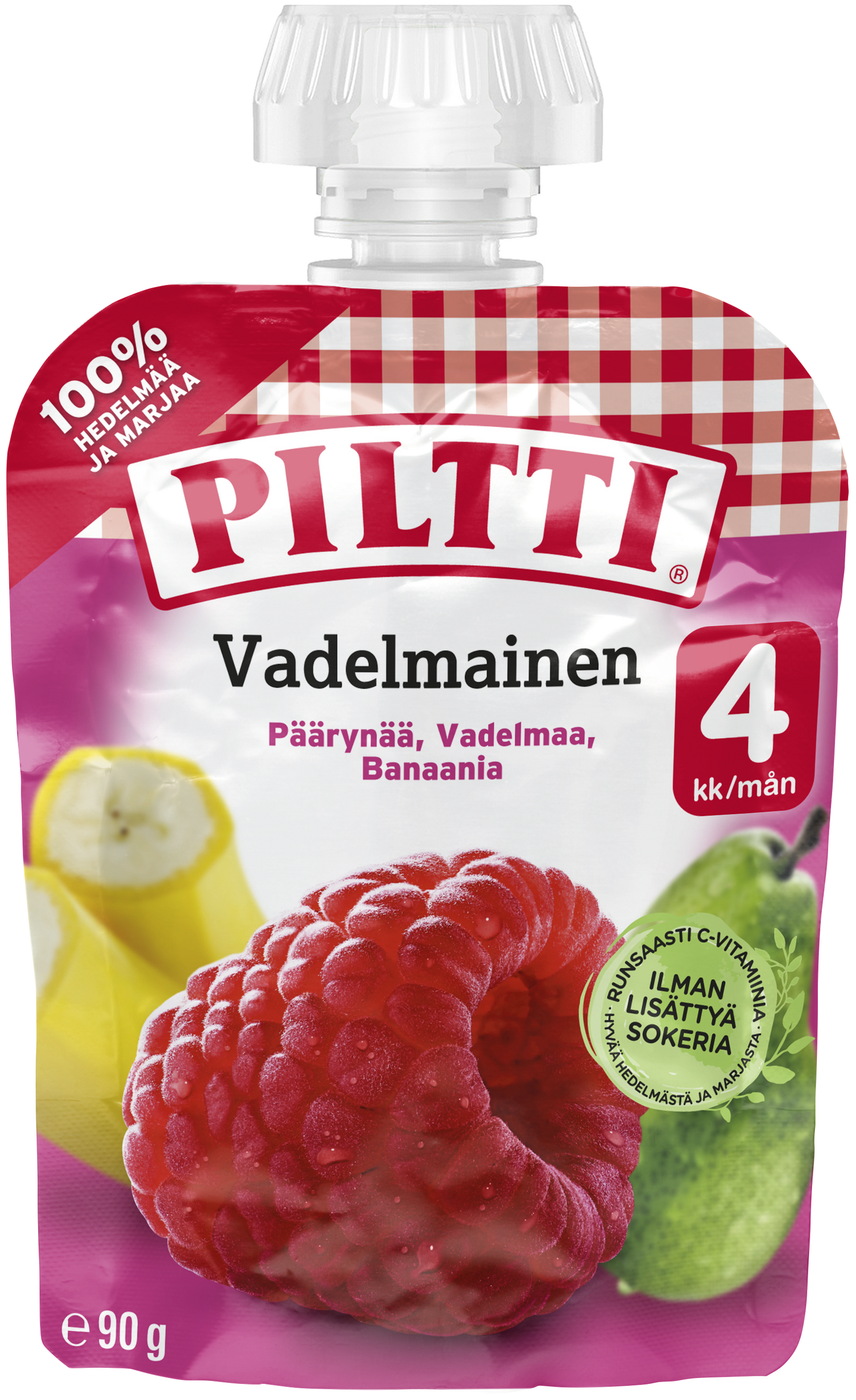 PILTTI Vadelmainen; Päärynää, vadelmaa ja banaania 90g on herkullinen yhdistelmä raikkaita hedelmiä ja ihanaa vadelmaa. Tämä välipala ei sisällä lisättyä sokeria eikä makeita mehutiivisteitä, ja se soveltuu helpoksi ja nopeaksi jälkiruoaksi ja välipalaksi vauvalle 4kk iästä alkaen. Lisäämällä PILTTI Vadelmainen -välipalaa PILTTI-lastenpuuron joukkoon saat helposti täyttävän välipalan myös isommalle lapselle. Säännöllinen ateriarytmi on tärkeä asia niin meille aikuisille kuin lapsillekin, ja PILTTI annospussit ovat käteviä välipaloja sekä kotona että reissussa. Tuotekehityksemme on jatkuvaa ja tuotteen koostumusta voidaan muuttaa. Luethan sen vuoksi ainesosaluettelon pakkauksesta aina ennen ruoan tarjoamista.