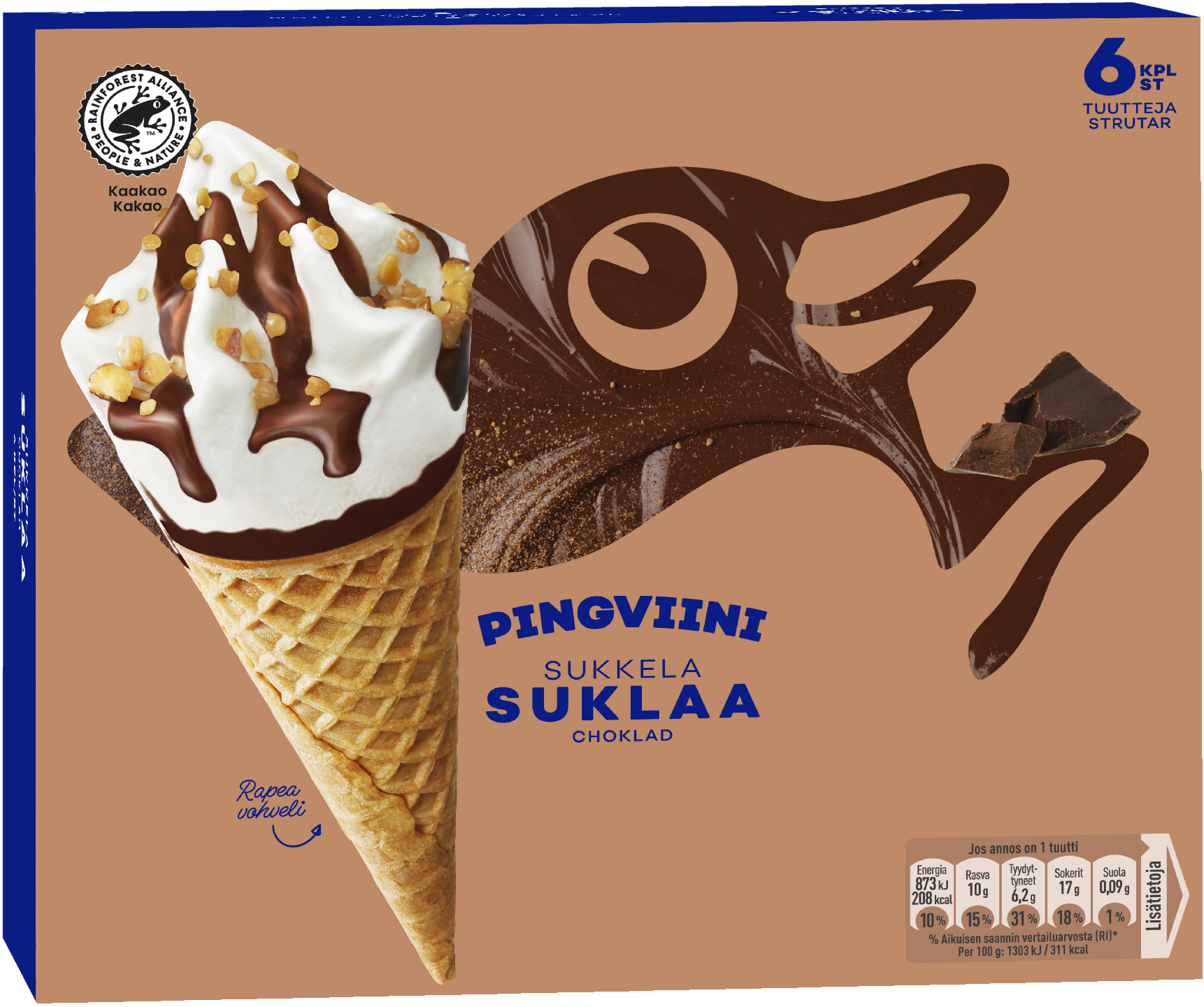 Suklaatuuttien klassikko löytyy monipakkauksesta! Pingviini Suklaa tuutti on vastustamaton yhdistelmä vaniljajäätelöä sekä herkullista suklaanmakuista kuorrutetta. Maun kruunaa mantelikrokantti. Tuotteen kaakao on Rainforest Alliace -sertifioitua. Jäätelö kielelle ja hymy huulille! Kaikki Pingviini-jäätelöt valmistetaan rakkaudella Suomessa, Turengin jäätelötehtaalla. Tuotteissamme on Avainlippu-merkintä. Kaikki pakkauksemme ovat 100 % kierrätettäviä.