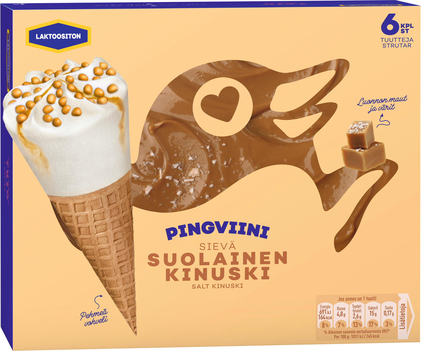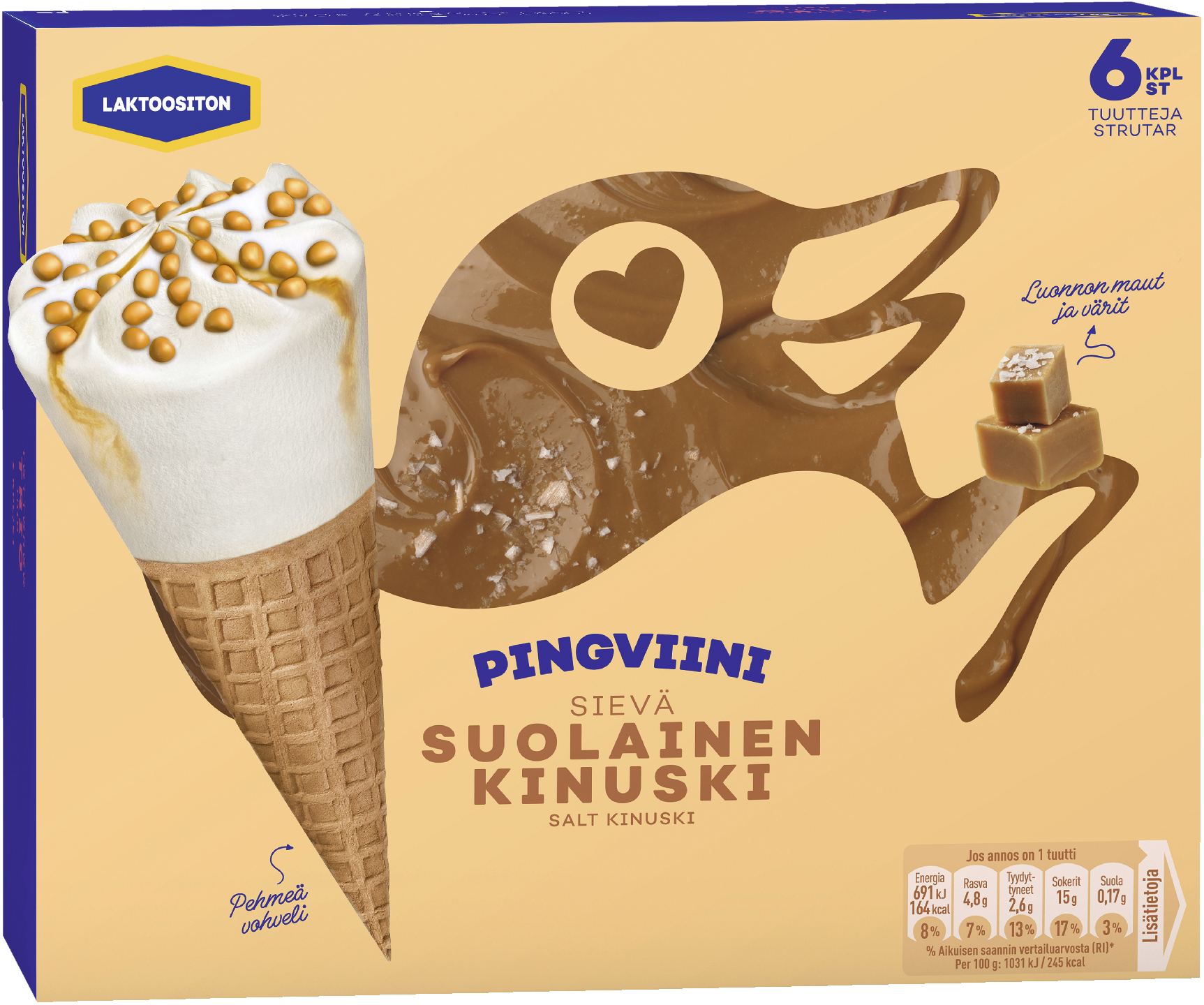 Laktoositon Pingviini Suolainen Kinuski tuutti hellii makuhermoja, sillä suolaisen kinuskikastikkeen ja makean vaniljakermajäätelön yhdistelmä on vastustamaton! Elämyksen kruunaavat tuutin pehmeät toffeepalat. Jäätelö kielelle ja hymy huulille! Kaikki Pingviini-jäätelöt valmistetaan rakkaudella Suomessa, Turengin jäätelötehtaalla. Tuotteissamme on Avainlippu-merkintä. Kaikki pakkauksemme ovat 100 % kierrätettäviä.