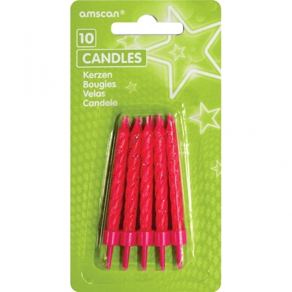 Pinkit kakkukynttilät, joissa kimalletta. Pakkaus sisältää 10 kpl kynttilöitä.