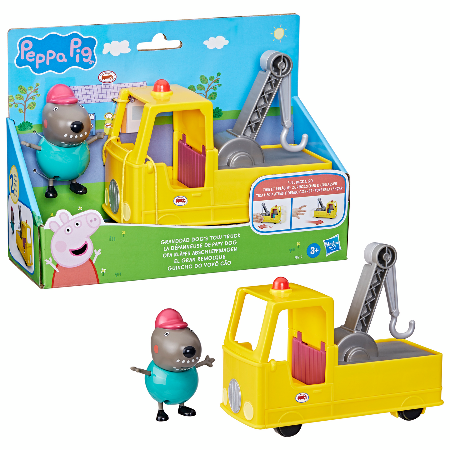 Vedä taaksepäin ja katso kun auto liikkuu eteen päin. Lisäksi lapset voivat liikuttaa nosturia. Hinaa muita Pipsa Possu kulkuneuvoja. Hytin katto ja sivuovi avautuvat.