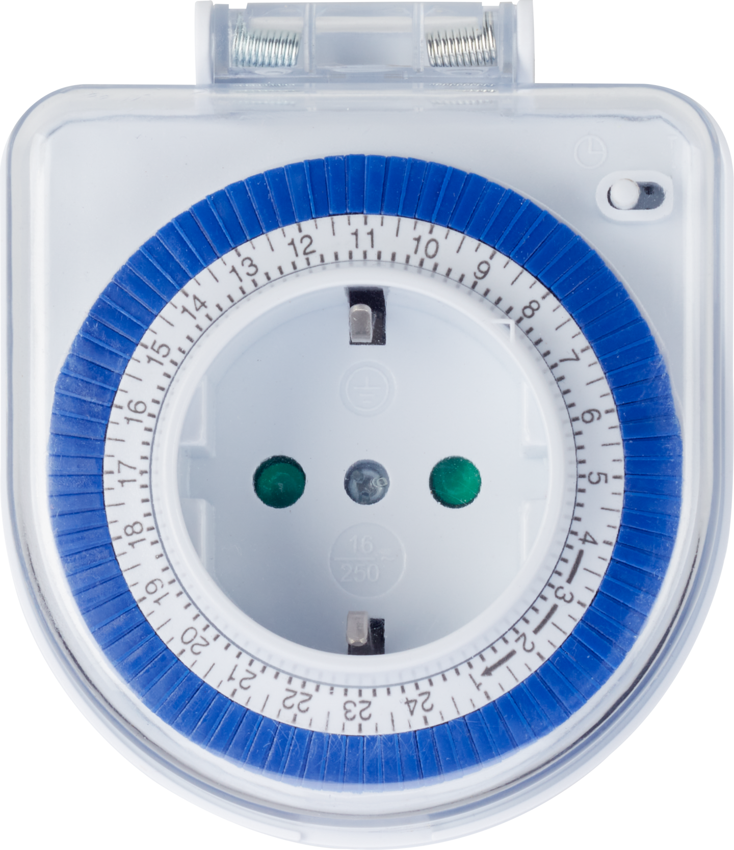 Ulkokäyttöinen, mekaaninen ajastin toimii 24h säätövälillä (IP44).