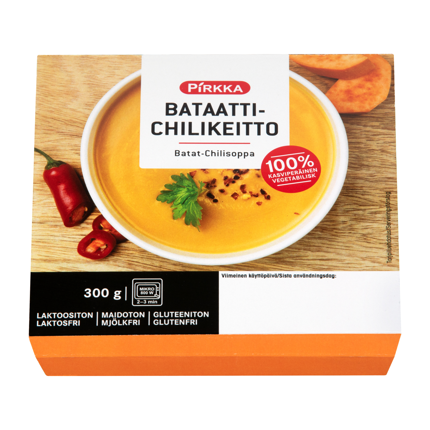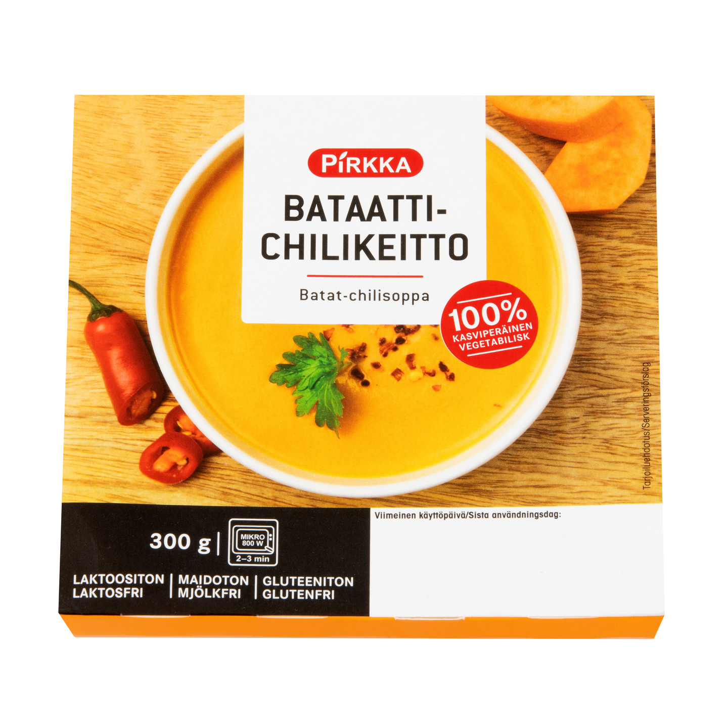 Pirkka bataatti-chilikeitto on silkkisen pehmeää, täyteläistä ja maukasta. Chiliä pehmentävät lempeä kookosmaito ja bataatti. Keitto on laktoositon ja gluteeniton, soveltuu vegaaniseen ruokavalioon. Valmistaja Snellman.