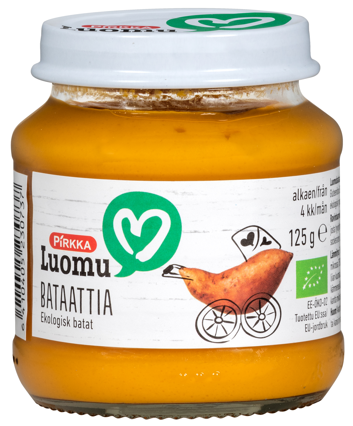 Pirkka Luomu bataatti sopii perheen pienimmille 4 kk alkaen. Vain luonnonmukaisesti viljeltyä bataattia sekä hieman rypsiöljyä sisältävä batattisose sopii hyvin uusien makujen totutteluun ja maistelun aloittamiseen. Tuote on pakattu lasipurkkiin, jossa se voidaan myös lämmittää mikrossa tai vesihauteessa. Helppo ottaa myös mukaan! Käytön jälkeen kierrätä purkki lasinkeräykseen ja kansi metallinkeräykseen.