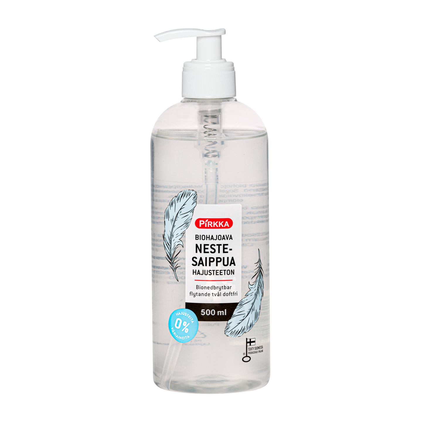 Pirkka biohajoava nestesaippua hajusteeton on hellävarainen saippua päivittäiseen käsien pesuun. Se on tehokas ja pitää ihon pehmeänä. Pirkka biohajoava nestesaippua hajusteeton on biohajoava, eikä se sisällä lainkaan väriaineita, hajusteita eikä eläinperäisiä ainesosia. Tuotteella on Avainlippu -merkki ja sen valmistaa Foxtel Orivedellä.