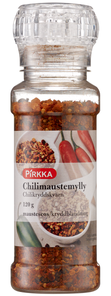 Pirkka chilimaustemylly on uudelleen täytettävä. Sopii erityisesti liha- ja broileriruokiin sekä kaikkiin ruokiin, joihin halutaan hieman tulisuutta.
