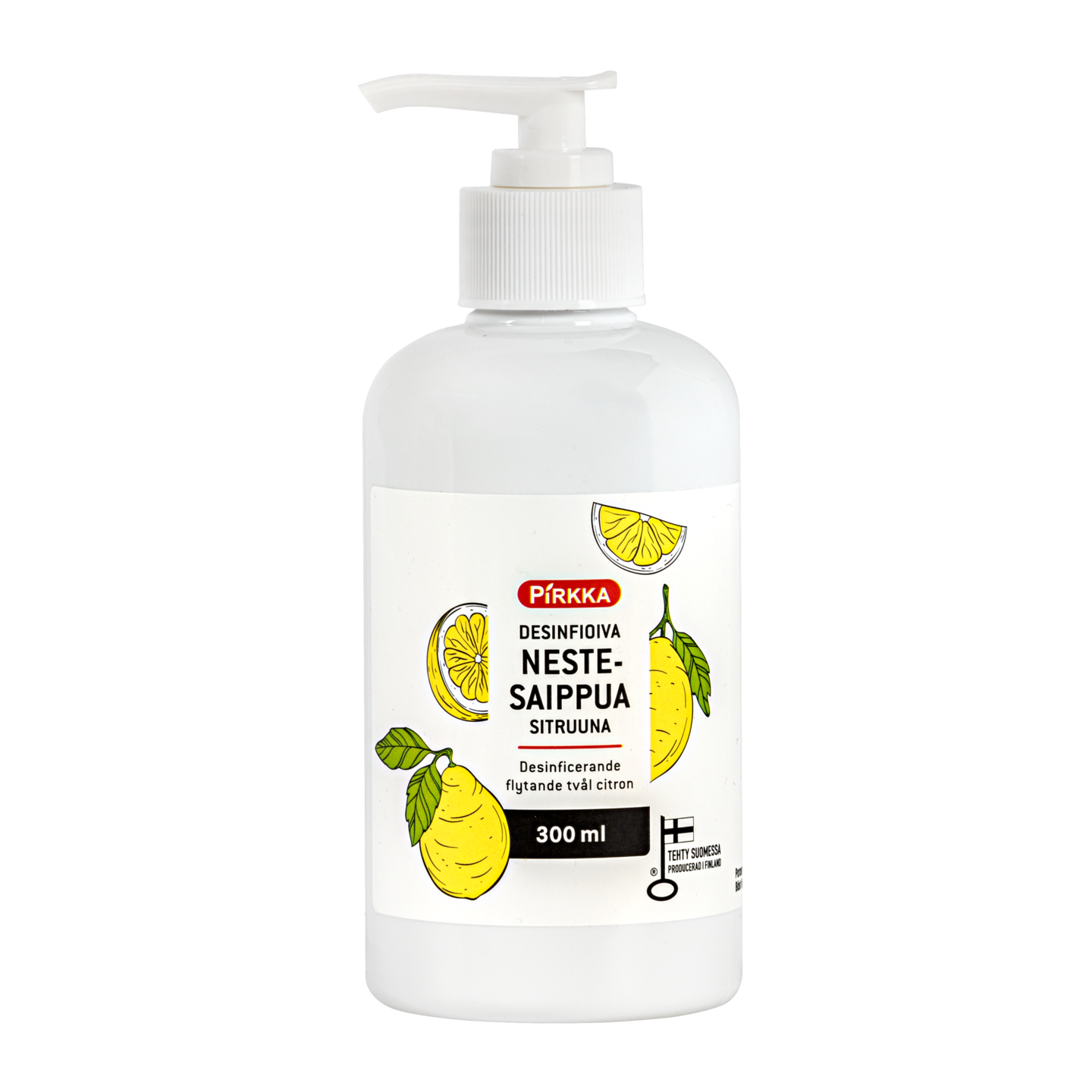 Pirkka desinfioiva nestesaippua 300ml sitruuna soveltuu päivittäiseen käsien pesuun ollen hellävarainen ja tehokas. Levitä saippuaa kosteisiin käsiin ja hiero noin minuutti ennen huuhtelemista.Tappaa koronavirukset ja influenssaviruksen H1N1.