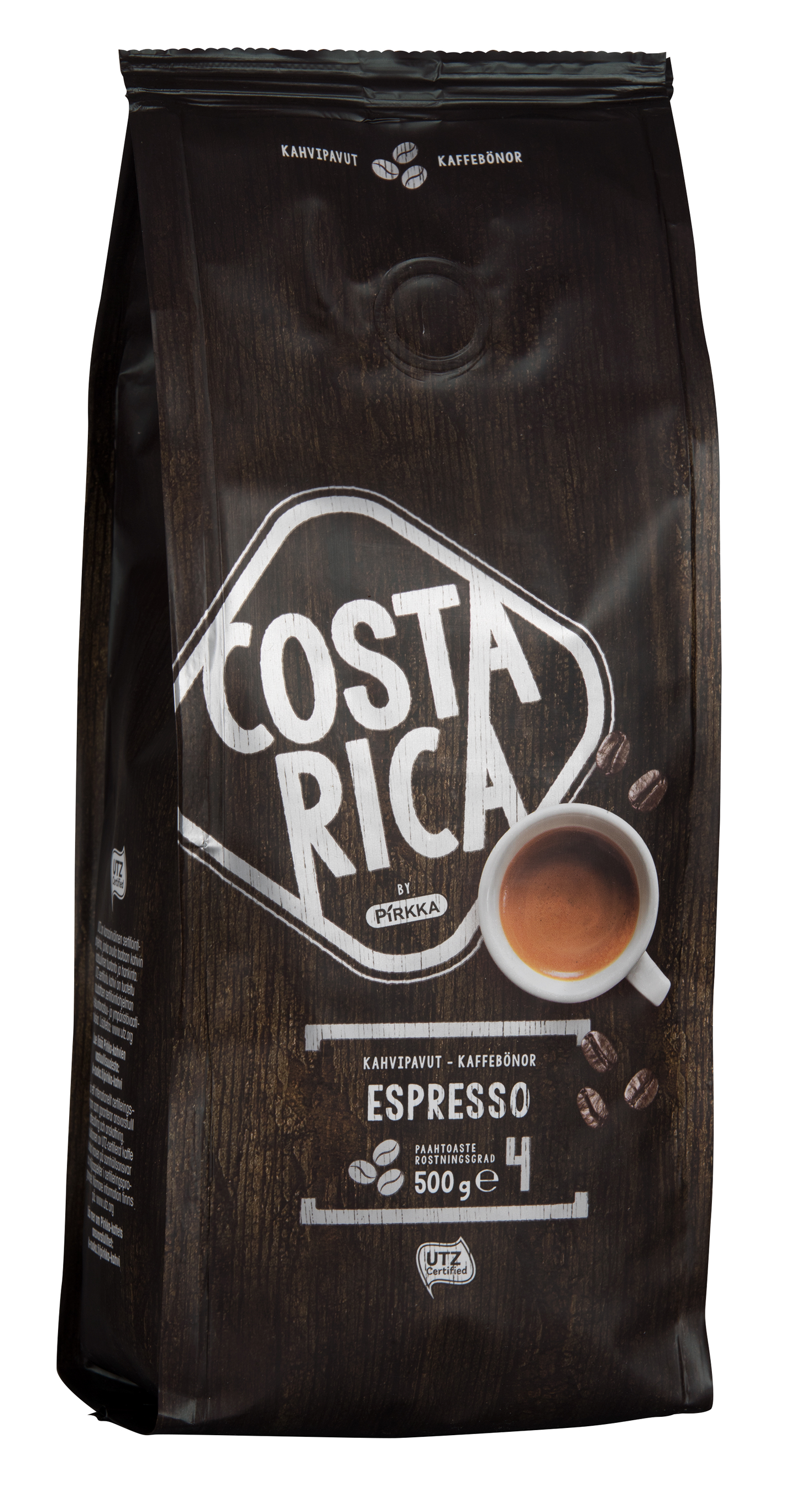 Pirkka Costa Rica espressopapu on tasapainoinen sekoitus tummapaahdettua Arabica- ja Robusta kahvia. Paahtoaste on 4. Käytä papujen jauhamiseen erillistä kahvimyllyä tai kahvilaitetta jossa on mylly. Makuprofiili on lempeän voimakas, vahva ja täyteläinen. Sopii erityisen hyvin nautittavaksi sellaisenaan lyhyenä ja vahvana espressona tai pohjaksi erilaisiin maitokahvijuomiin kuten cappucinoon, latteen tai affogatoon. Kahvi on Rainforest Alliance -sertifioitua.
