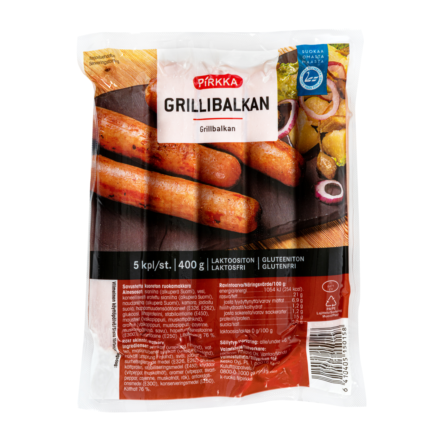 Pirkka grillibalkan on lihaisa kuoreton makkara. Hieman savunmakuinen ja mausteinen makkara sopii erinomaisesti grillattavaksi ja ruoanvalmistukseen kuten kastikkeisiin ja keittoihin. Laktoositon ja gluteeniton tuote.