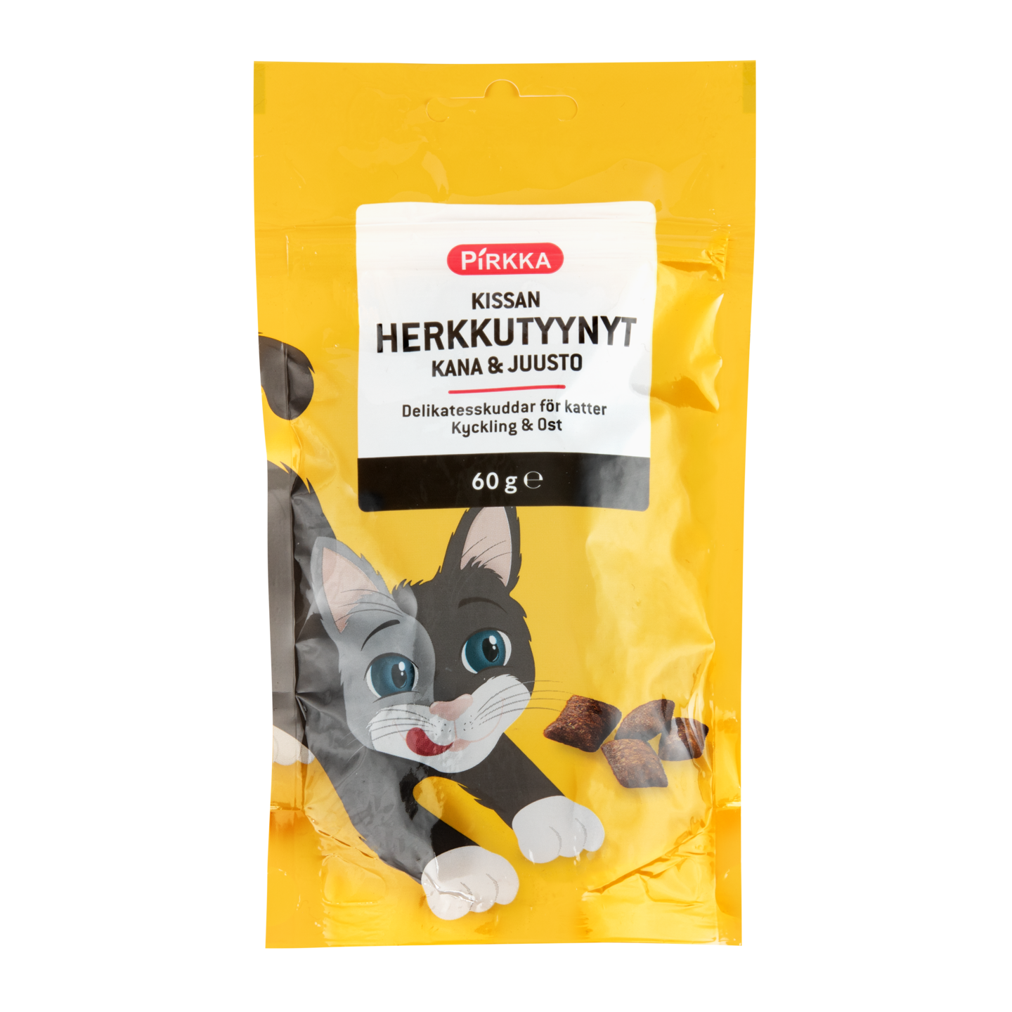 Kissan makupala, rapeat ja rouskuvat herkkutyynyt juuston- ja kananmakuisena. Kätevä uudelleen suljettava pussi.