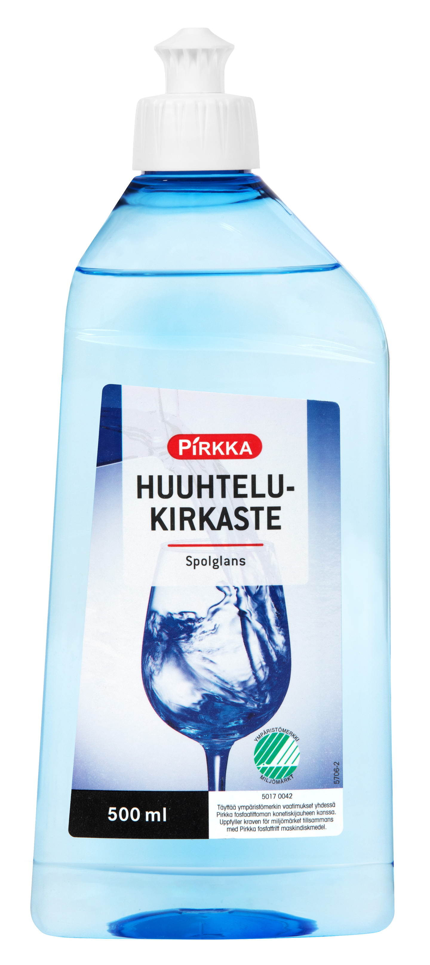 Pirkka huuhtelukirkaste edistää veden valumista, jolloin astiat kuivuvat nopeasti ilman kuivumisjälkiä. Täyttää Joutsenmerkin vaatimukset yhdessä Pirkka fosfaatittoman konetiskijauheen kanssa.