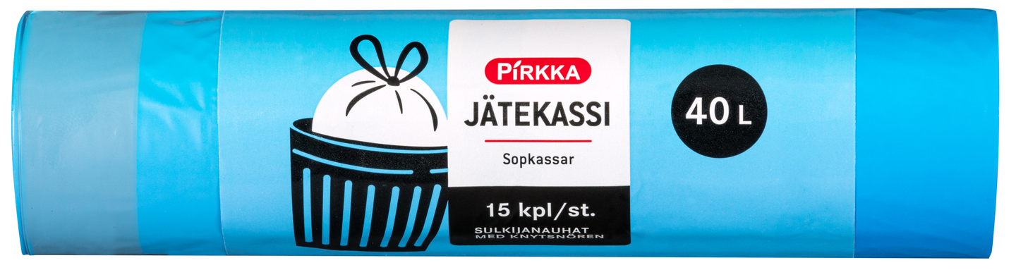Kätevä jätekassi, jossa narut, joilla kassin sulkeminen on todella helppoa. Pussin koko on 55 x 60 cm.