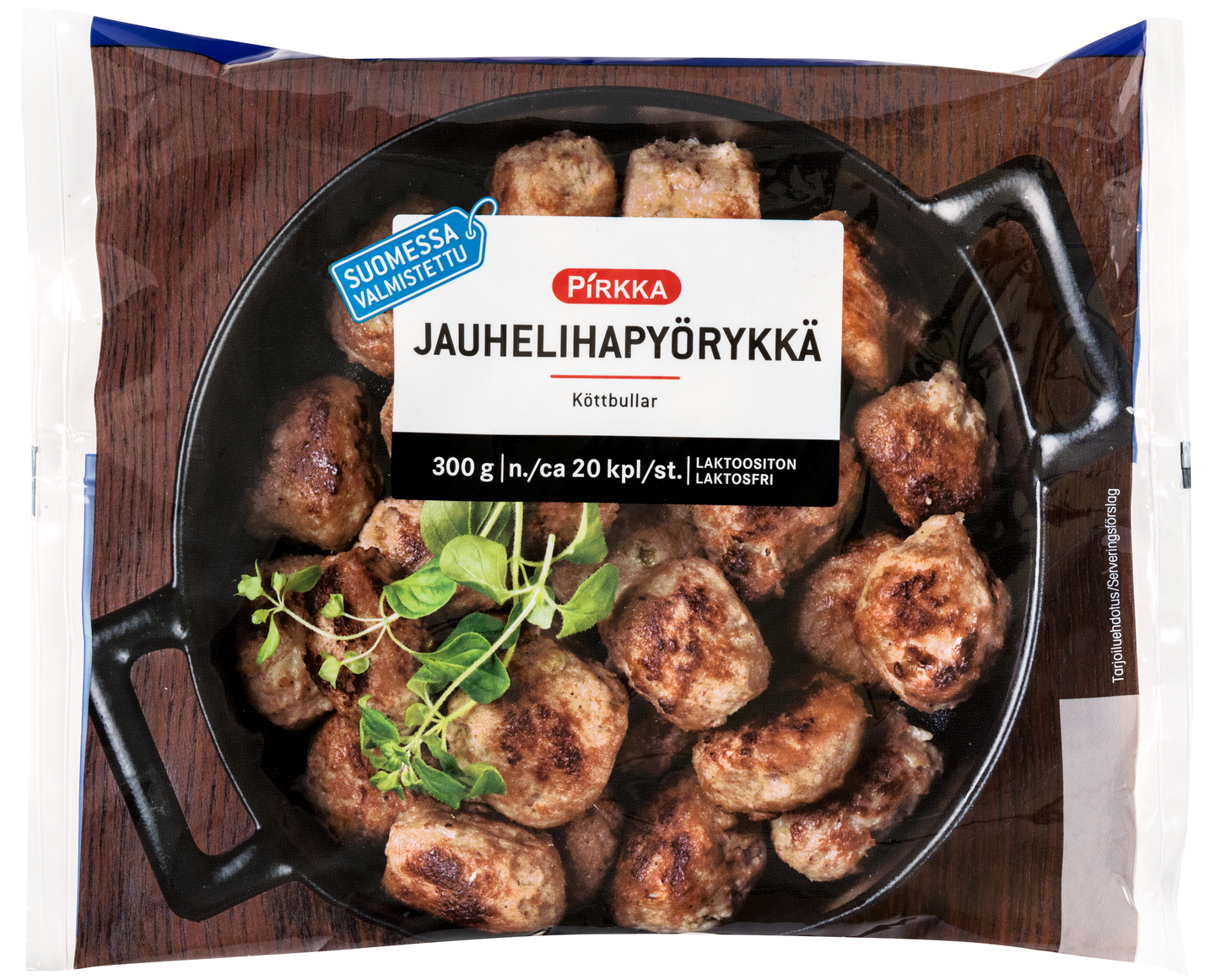 Suomalaisesta jauhelihasta valmistettuja maukkaita lihapullia. Tuote on laktoositon. Valmistettu Suomessa.