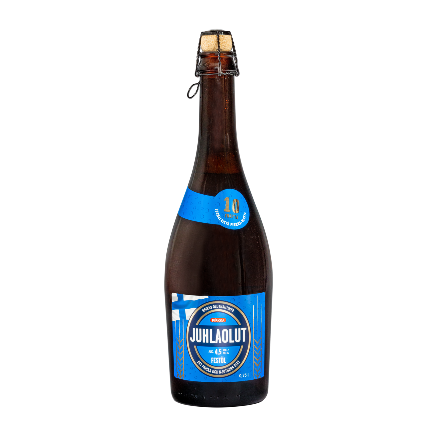 Pirkka olutta on saanut kaupoista jo 10 vuotta! Sen kunniaksi tuttu sininen Pirkka 4,5 % lager-olut pullotetaan 0,75 l samppanjapulloon. Rajoitettu erä. Valmistaja on Olvi Oyj.