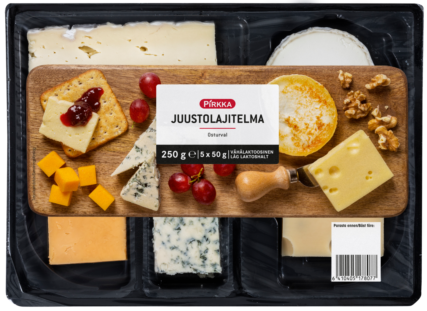 Pirkka juustolajitelma sisältää brie- ja vuohenjuustoa, emmentalia, sinihomejuustoa sekä cheddaria. Lajitelmasta riittää 1-2 herkuttelijalle.