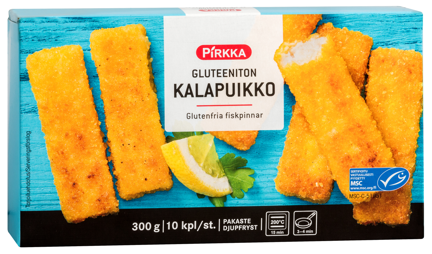 Pirkka gluteeniton kalapuikko on gluteeniton versio koko perheen ja etenkin lasten suosikkiruoasta. Kalapuikkojen paneroinnissa on käytetty mm. perunatärkkelystä sekä riisi- ja maissijauhoja. Paista kalapuikot rapeiksi pannulla tai uunissa. Valmistettu MSC-sertifioidusta kalasta.