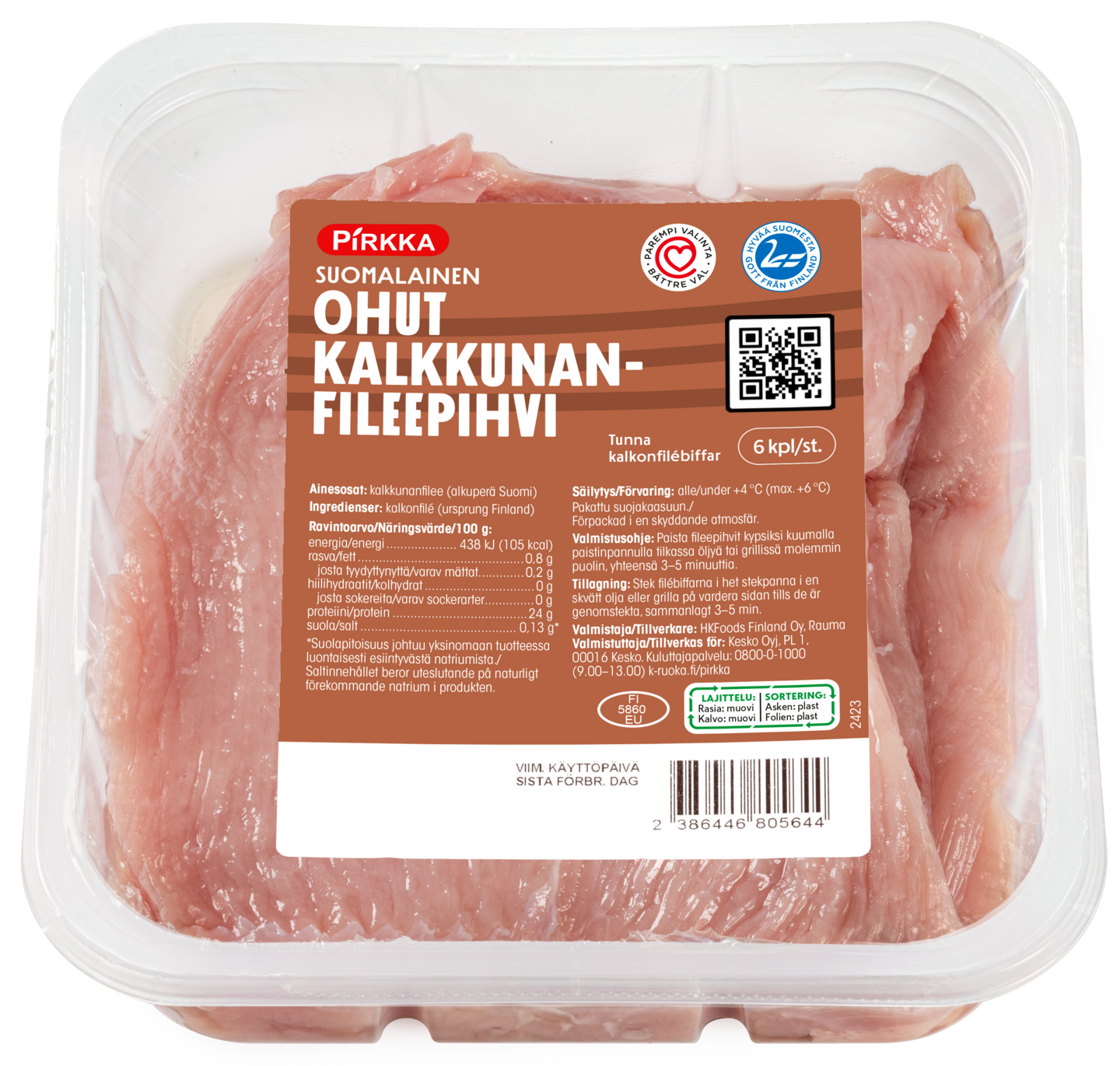 Suomalaisesta kalkkunanfileestä ohueksi leikattu maustamaton fileepihvi moneen käyttöön. Yksittäisen tuotteen keskimääräinen paino on 600 g.