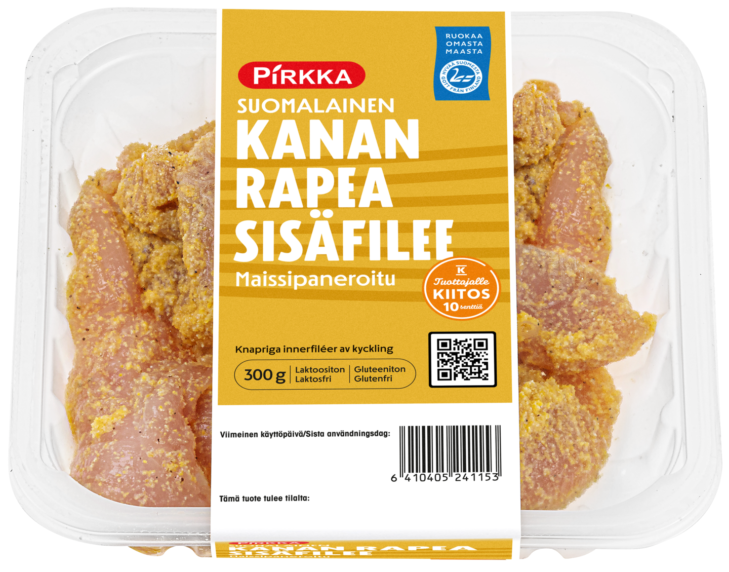 Suomalaista kanan sisäfileetä maissipanetoituna ja maustettuna. Paistuvat kauniin kullankeltaisiksi ja maistuvan herkullisiksi.