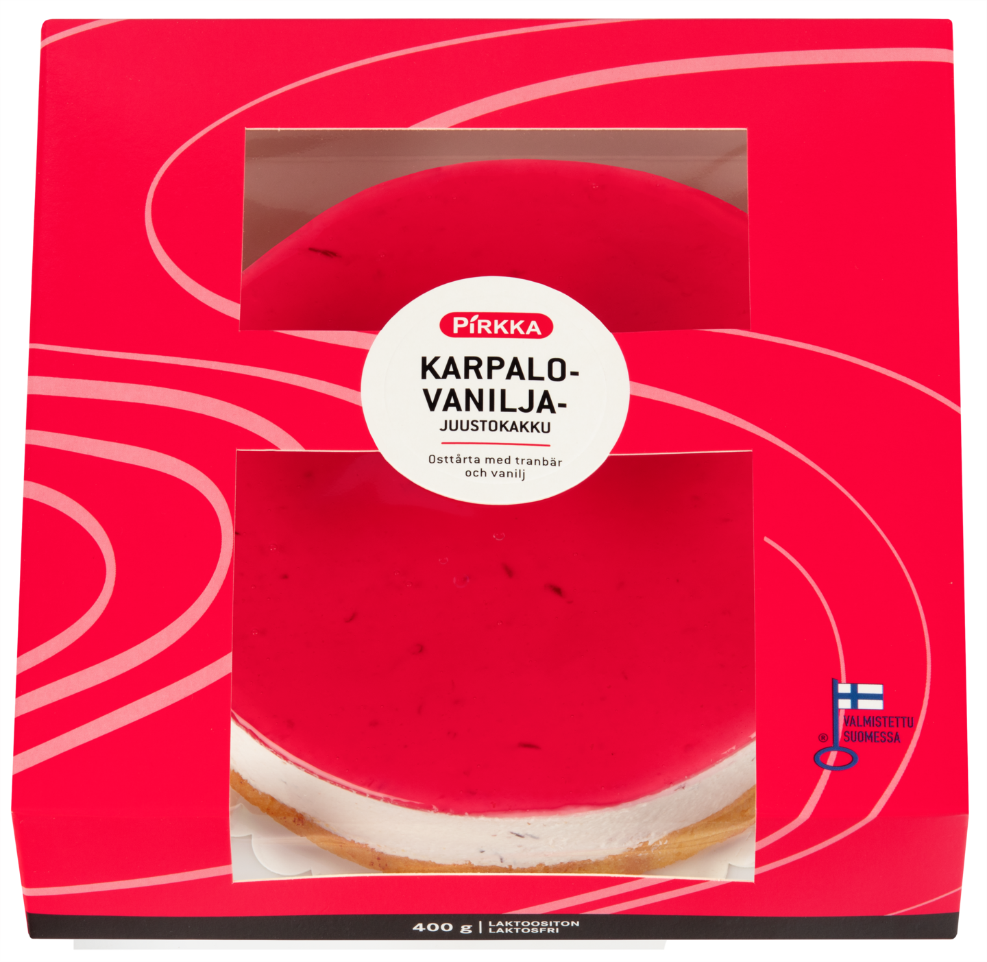Pirkka karpalo-vaniljajuustokakku on juhlava kahvipöydän tarjottava. Kakussa on pehmeä karpalon ja vaniljanmakuinen tuorejuustomoussetäyte. Karpalon makuinen kiille viimeistelee hienostuneen kokonaisuuden. Tarjoa kakku sellaisenaan tai koristele juhlapäivän teeman mukaan. Kakusta riittää noin 6-8 henkilölle. Kokeile myös muut sarjan uutuusmaut Pirkka mango-passionjuustokakku sekä suklaajuustokakku. Kakut valmistaa Suomessa Riitan Herkku.