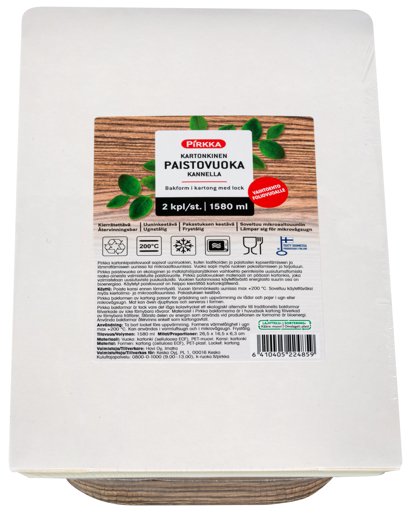 Pirkka Eko kartonkipaistovuoat sopivat uuniruokien kypsentämiseen ja lämmittämiseen uunissa tai mikroaaltouunissa. Vuoka sopii myös ruokien pakastamiseen ja tarjoiluun. Pirkka Eko paistovuoka on ekologinen ja matalahiilijalanjälkinen vaihtoehto perinteisille uusiutumattomista raaka-aineista valmistetuille paistovuoille. Vuokien materiaali on pääosin kartonkia, joka valmistetaan uusiutuvista puukuiduista. Tuotannossa käytettävästä energiasta suurin osa on bioenergiaa.