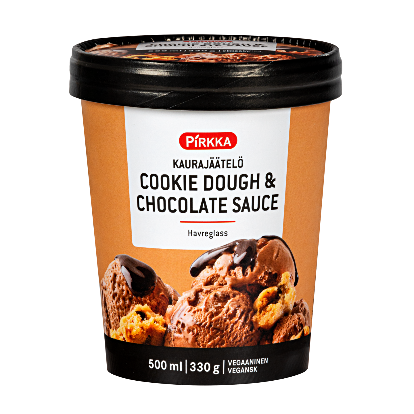 Pirkka kaurajäätelö cookie dough & chocolate sauce sisältää kaurapohjaista kaakaojäätelöä, suklaanmakuista kastiketta ja keksitaikinapaloja. Vegaaninen. Valmistaja Caminito, Suomi.