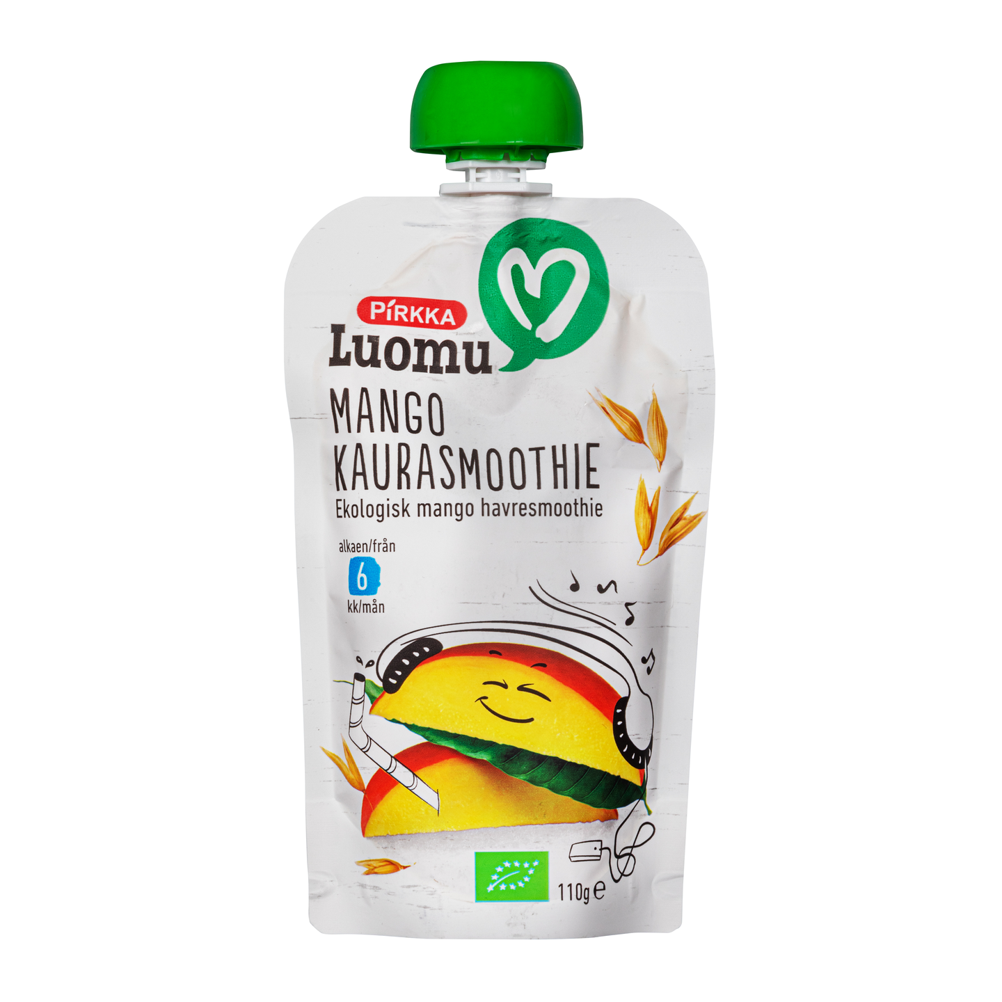 Pirkka Luomu mango kaurasmoothie sopii perheen pienimmille heti 6 kk alkaen. Vain luonnonmukaisesti viljeltyä kauraa, mangoa ja hieman sitruuna sisältävä smoothie on maittava välipala, joka ei sisällä lisättyä sokeria. Tuote on pakattu kevyeen korkilliseen pussipakkaukseen, joka säilyy huoneenlämmössä. Käytön jälkeen pakkaus voidaan kierrättää muovinkeräykseen. Kokeile myös muita maistuvia Pirkka Luomu lasten smoothieita!