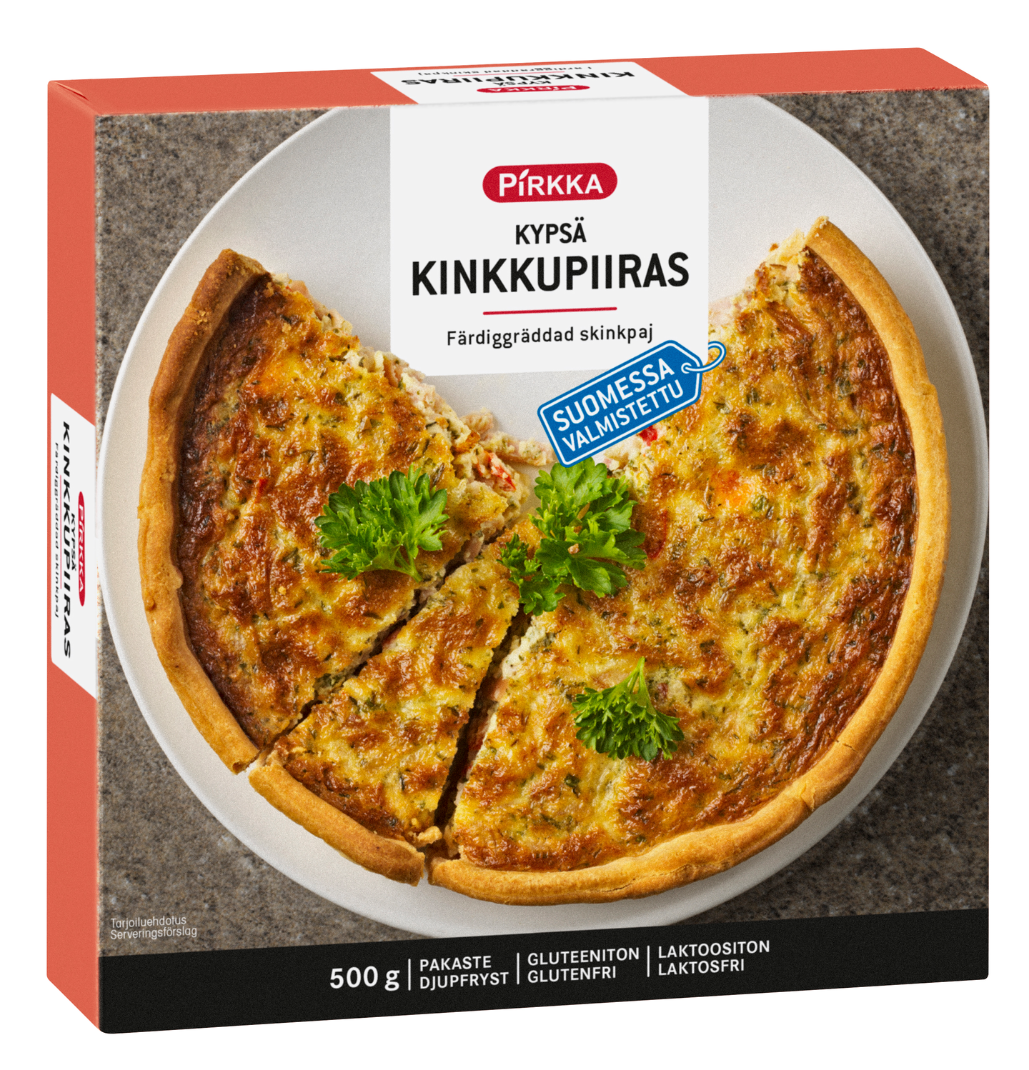 Pirkka kinkkupiiras on sulattamista vaille valmis maistuva suolainen piirakka, jonka täytteenä on kinkkua ja paprikaa. Sulata piirakka uunissa ja tarjoa hieman lämpimänä. Koristele yrteillä ja tarjoa salaatin kanssa. Tuote on gluteeniton, laktoositon ja valmistettu Suomessa.