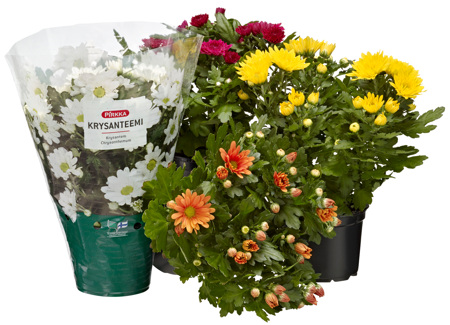 Pirkka-krysanteemi on kestävä sisäkukka. Sen värit vaihtuvat sesongin mukaan. Hoito-ohje: Krysanteemi viihtyy valoisassa paikassa huoneenlämmössä ja jopa viileämmässäkin. Se viihtyy myös suorassa auringonpaisteessa, mikäli vettä on riittävästi saatavilla. Altakastelu on suositeltavin haalealla vedellä säännöllisesti. Krysanteemi on kertakukkija, ja tarvitsee kukkaravinnetta vain muutaman kerran. Kesällä krysanteemin voi istuttaa parvekelaatikkoon tai puutarhaan.Ruukkukrysanteemin saatavuus elokuu.