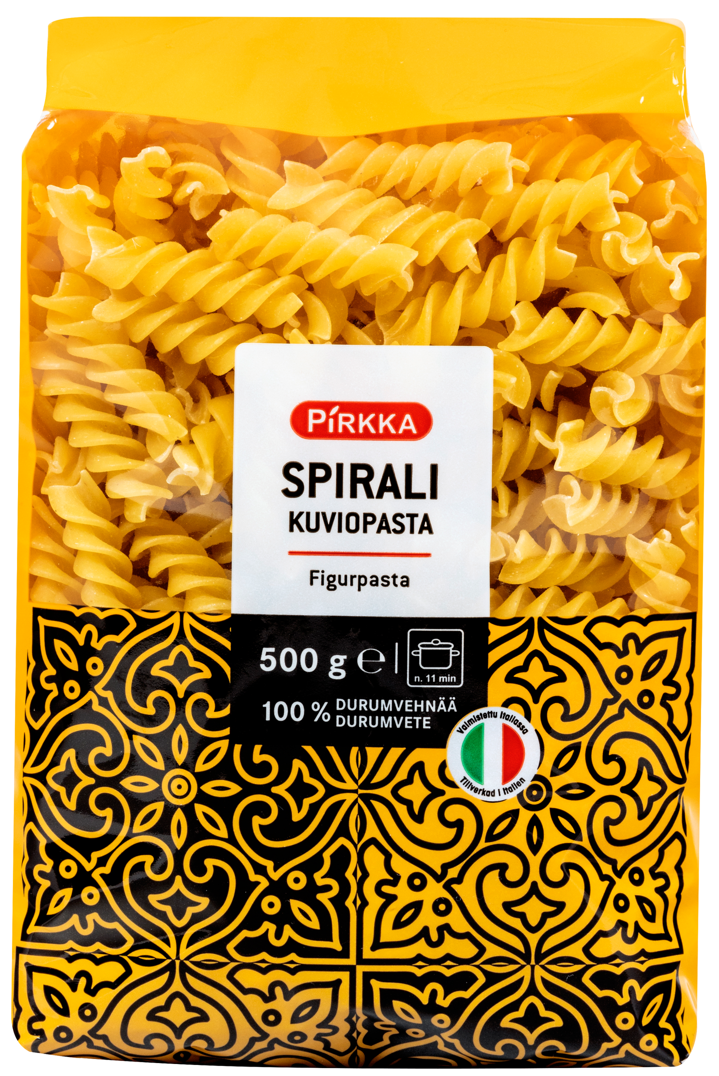Pirkka pasta spirali, kiertein spiraalipasta 100 % durumvehnästä. Sopii kastikkeiden kanssa tarjottavaksi, salaatteihin ja erilaisiin paistoksiin. Valmistusmaa Italia.