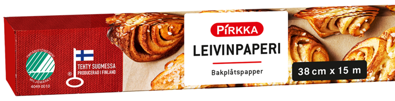 Pirkka leivinpaperi 38 cm x 15 m on valkaisemattomasta selluloosasta valmistettu molemmin puolin silikonoitu rasvatiivis leivinpaperirulla. Riittoisasta rullasta riittää noin 35 uuteen käyttökertaan ja puhtaan tuotteen voi käyttää myös uudelleen. Tuote on biohajoava. Pirkka leivinpaperilla on Joutsen- ja Avainlippu-merkki ja se valmistetaan Suomessa.