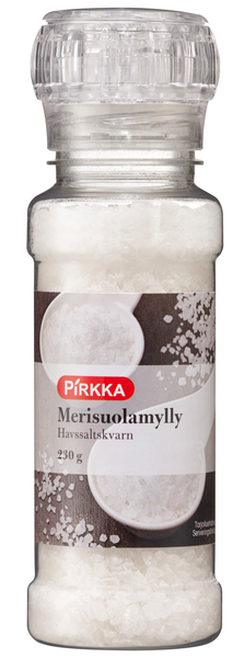 Pirkka merisuolamylly on uudelleen täytettävä. Kaikkeen ruoanlaittoon ja pöytämausteeksi.
