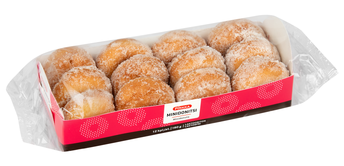Pirkka minidonitsit ovat hauskoja pikkuherkkuja kahvin tai kaakaon kanssa tarjottavaksi. Minidonitsit ovat laktoosittomia ja ne leivotaan Malvialan leipomossa Töysässä.
