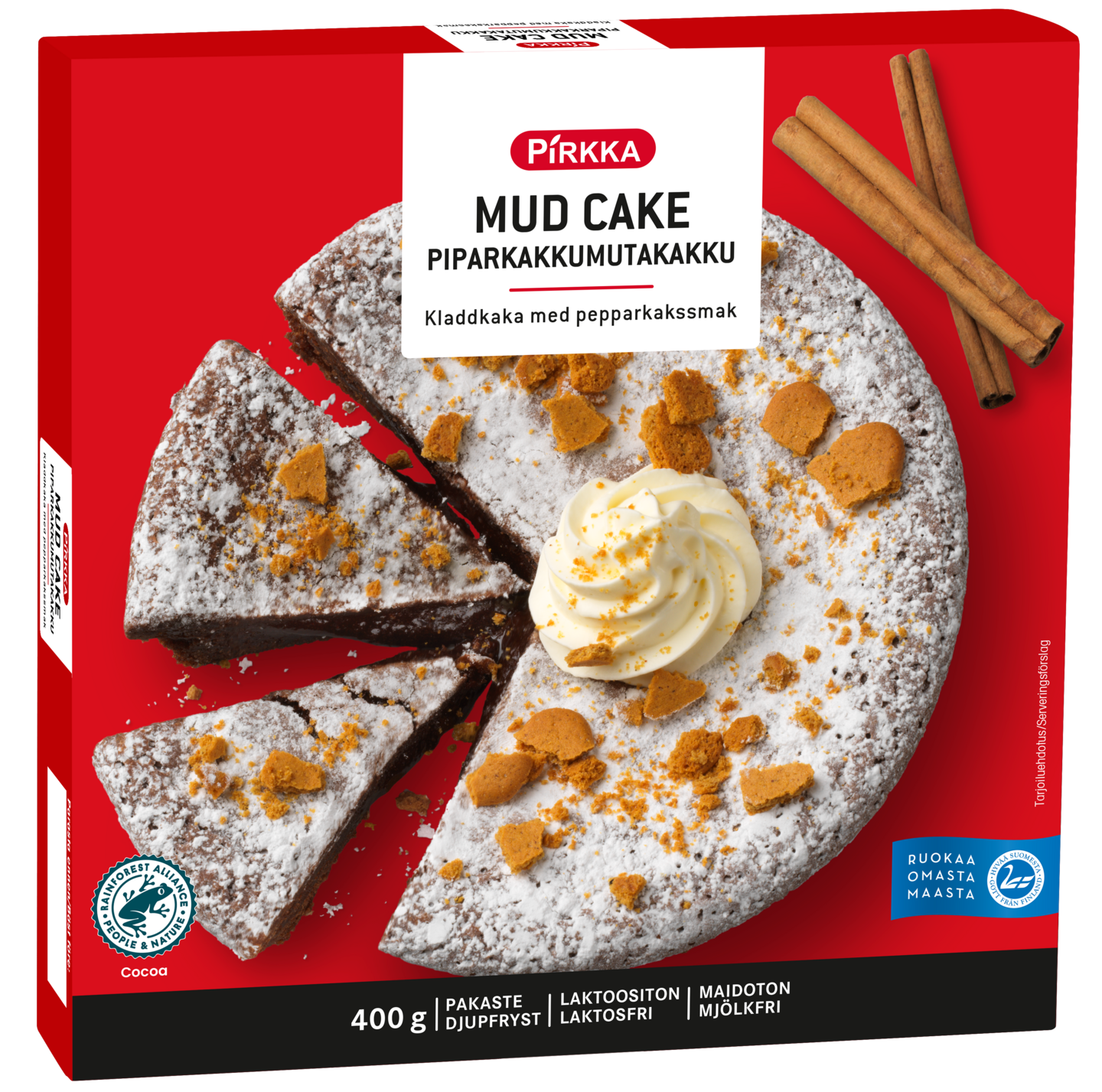 Hurmaavilla joulun mausteilla maustettu Pirkka piparkakku mud cake on sulattaen valmis tarjottava talven juhlasesonkien herkutteluihin. Lämmitä halutessasi hieman ennen tarjoilua ja tarjoa vaniljajäätelön tai kermavaahdon kanssa. Tuote on maidoton ja sillä on Hyvää Suomesta -merkki. Sesonkituote, myynnissä vain rajoitetun ajan.