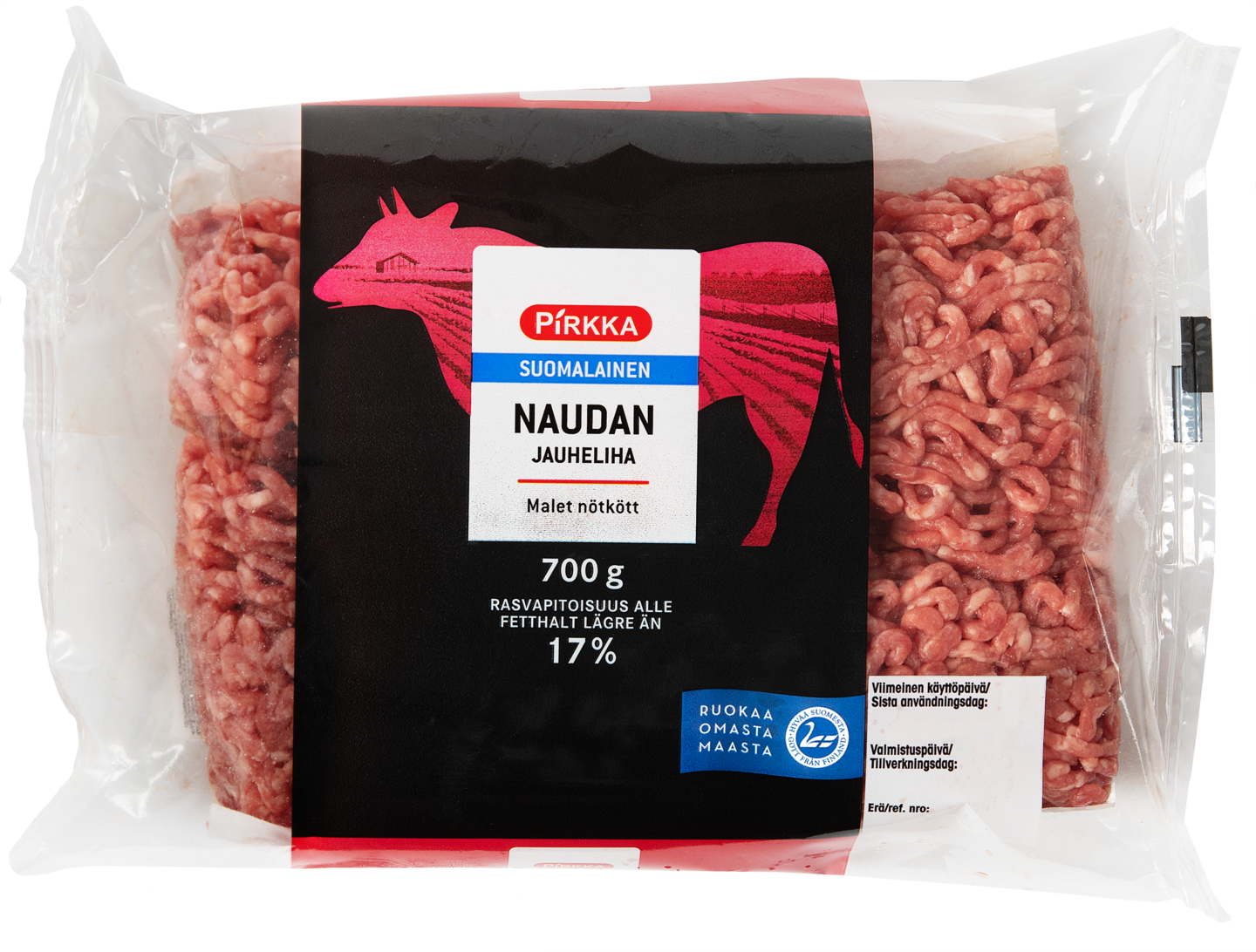 Pirkka naudan jauheliha on korkealaatuista suomalaista naudan jauhelihaa. Rasvapitoisuus enintään 17 %. Isompi pakkauskoko 700 g.