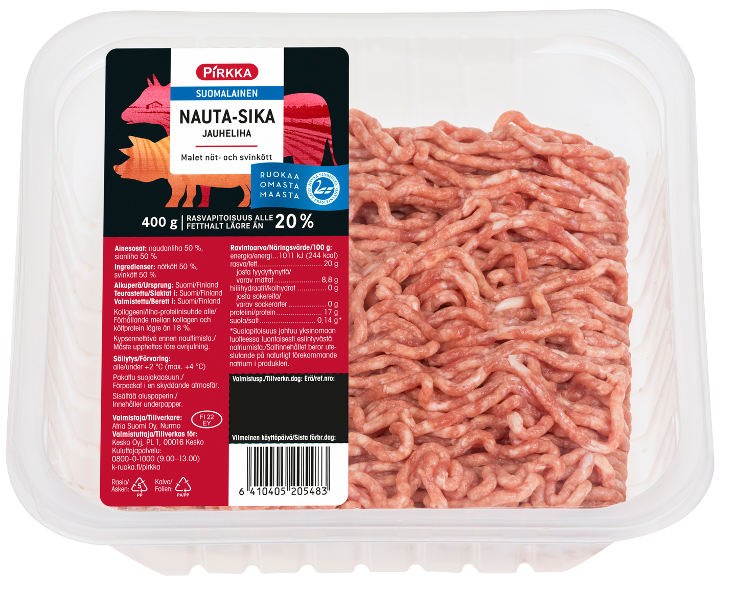 Pirkka suomalainen nauta-sika jauheliha 20% 400g