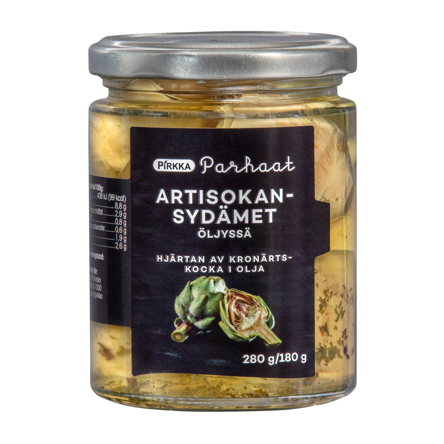 Basilikalla, persiljalla ja valkosipulilla maustettuun öljyyn säilöttyjä italialaisia artisokan sydämiä. Artisokat ovat herkullisia sellaisenaan, salaateissa, pastassa tai pizzassa täytteenä. Hyödynnä myös yrttiöljy salaatinkastikkeena tai leivän kanssa.