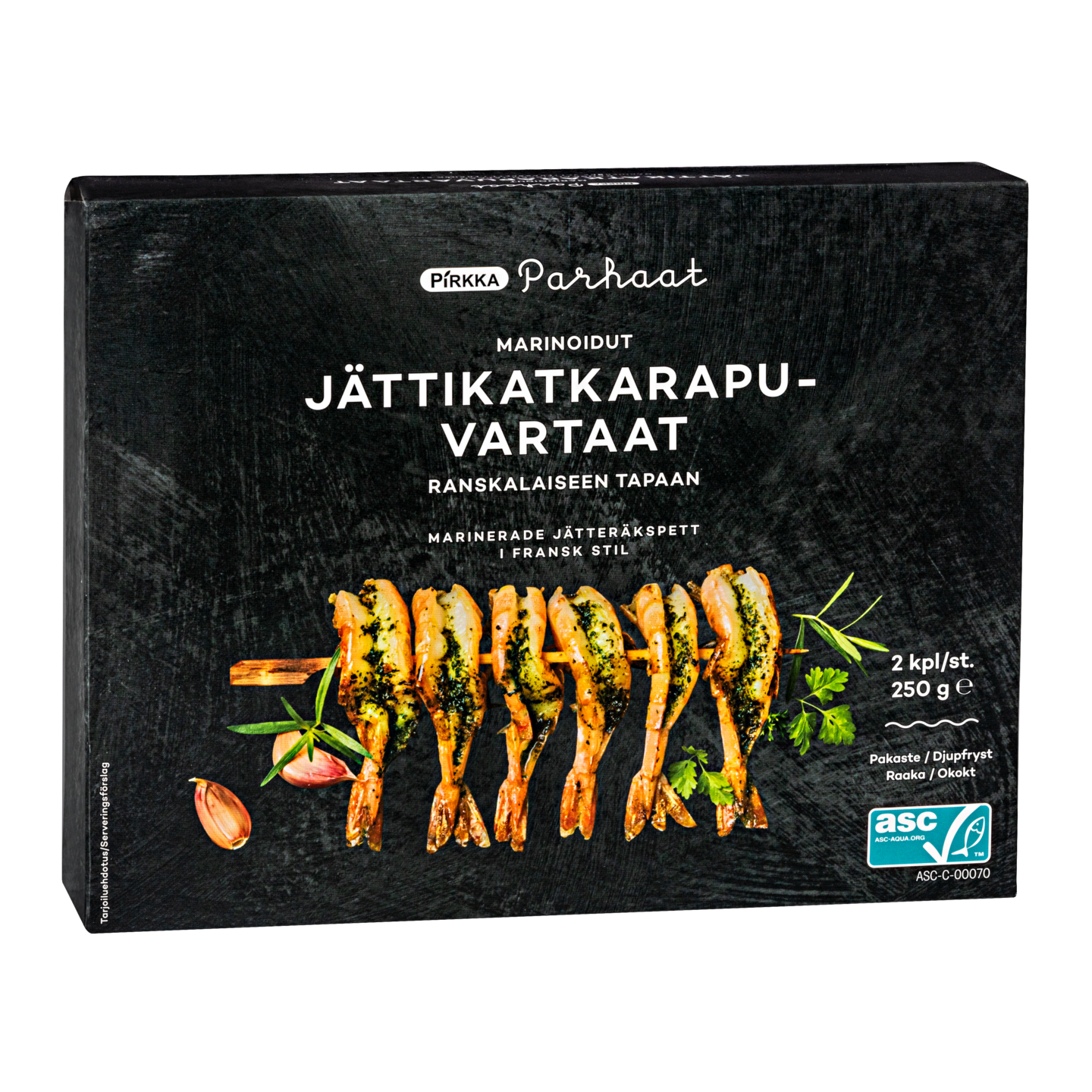 Marinoidut jättikatkarapuvartaat ranskalaiseen tapaan on helppo kypsentää pakkauksessa olevassa foliovuoassa uunissa tai grillissä. Tarjoa maukkaat vartaat alkuruokana sellaisenaan tai salaatin kanssa. ASC-sertifioitu.