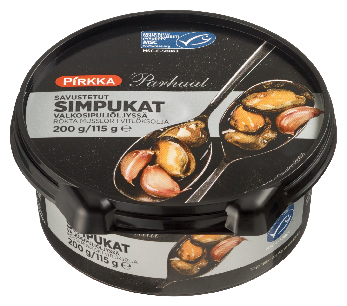 Pirkka Parhaat savustetut simpukat valkosipuliöljyssä 200g/115g MSC