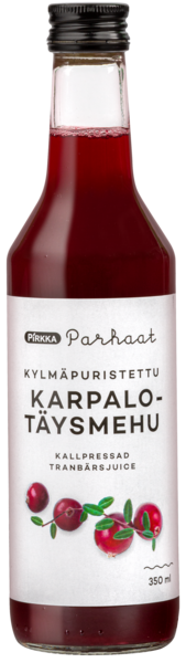 Kylmäpuristettu täysmehu valmistetaan prässäämällä marjat sellaisenaan. Mehuun ei lisätä mitään. Kylmäpuristamalla maut ja vitamiinit saadaan talteen parhaalla mahdollisella tavalla. Vahva ja puhtaanmakuinen täysmehu on hyvää sellaisenaan shottina tai laimennettuna vedellä esimerkiksi 1 + 4 suhteella. Karpalotäysmehu on erinomaista myös juomasekoituksissa tai ruoanvalmistuksessa. Kokeile esimerkiksi riistaruokien kastikepohjaan. Täysmehut valmistetaan Sotkamossa, Arctic Internationalilla.