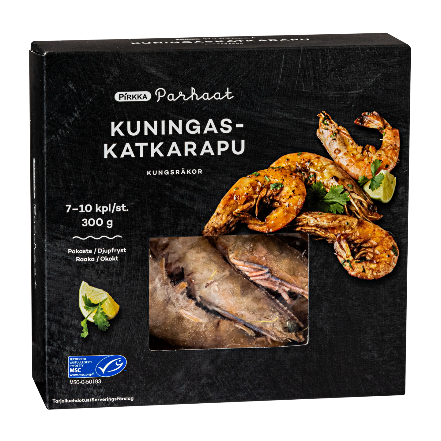 Pirkka Parhaat kuningaskatkaravut ovat ylellisen isoja, kuorellisia ja raakoja. Ne sulatetaan ja kypsennetään paistamalla tai grillaamalla. Ne sopivat esimerkiksi vartaisiin, salaatteihin, pastoihin, risottoihin, wokkeihin, keittoihin ja paellaan. MSC-sertifioitu