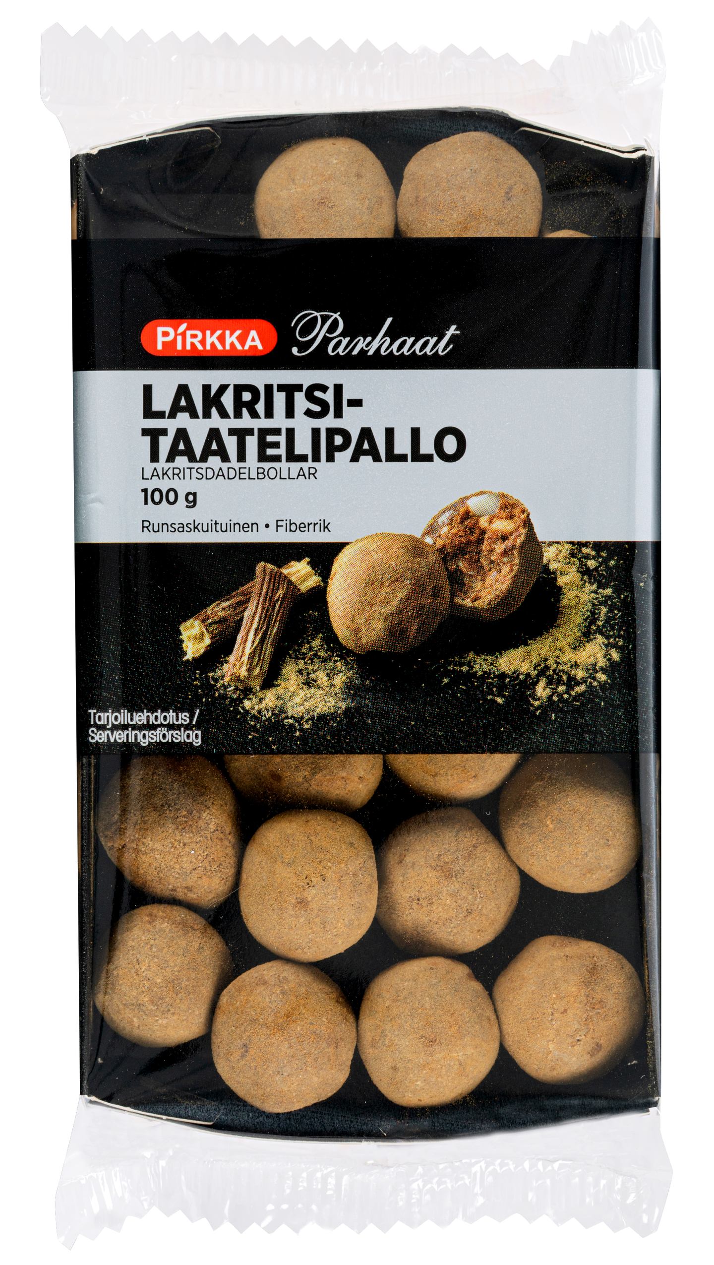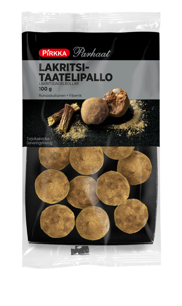 Pirkka Parhaat lakritsitaatelipallot on tehty taateleista ja manteleista. Pallot on puuteroitu lakritsijauheella. Herkuttele itse tai anna lahjaksi. Huomioithan, että taatelien kivet on poistettu, mutta ne saattavat silti sisältää kiven palasia.