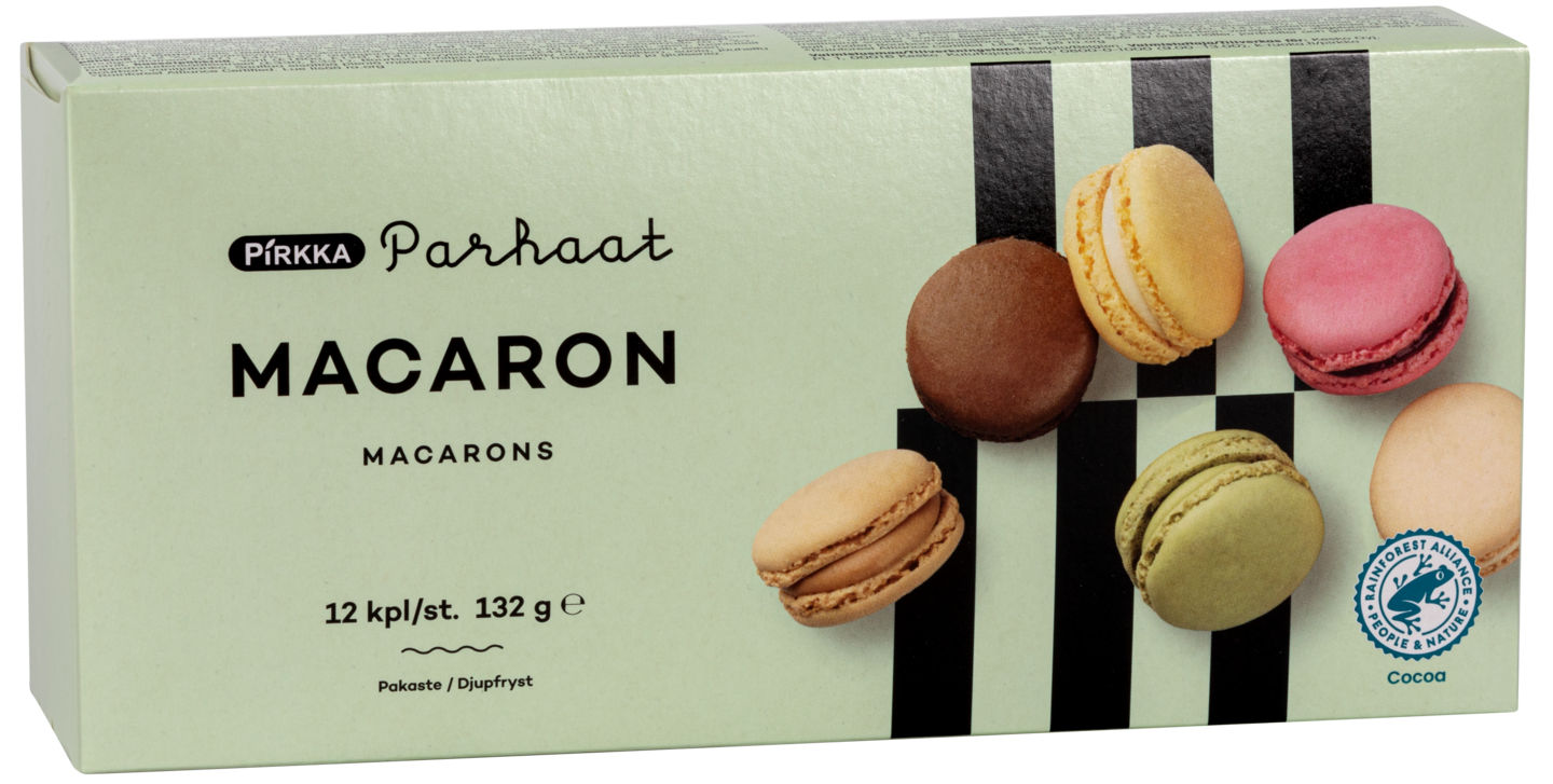 Perinteisiä, värikkäitä, pieniä ranskalaisia mantelileivoksia. Suussa sulavia leivoksia on kuusi eri makua, pistaasi, sitruuna, suklaa, suolakinuski, vadelma ja vanilja. Herkuttele sellaisenaan tai käytä vaikka kakun koristeluun. Myydään pakasteena.