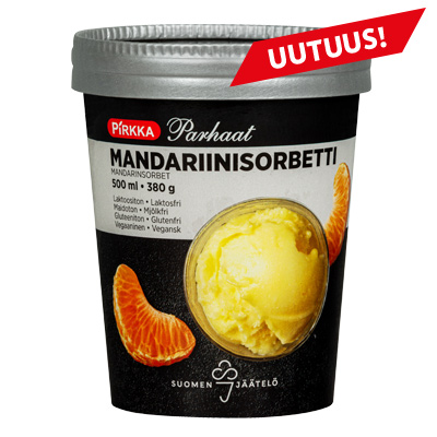 Pirkka Parhaat mandariini sorbetti on raikas jälkiruoka. Suomen Jäätelön valmistamat herkulliset ja laadukkaat artesaanisorbetit sopivat myös vegaaneille.