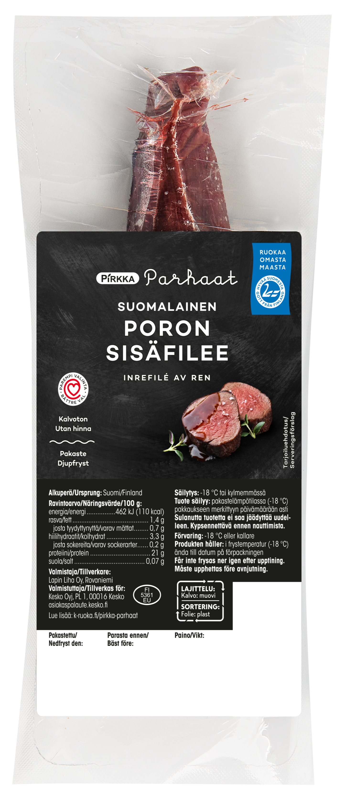 Pirkka Parhaat poron sisäfilee on murea ja laadukas suomalainen lihatuote erityisiin hetkiin. Filee kypsyy nopeasti ja sopii erinomaisesti paistettavaksi pannulla tai grillissä. Sen hienostunut maku täydentyy yksinkertaisilla mausteilla ja klassisilla lisukkeilla. Herkullinen valinta juhlavaan ateriaan vuoden ympäri. Yksittäisen tuotteen keskimääräinen paino on 150 g.