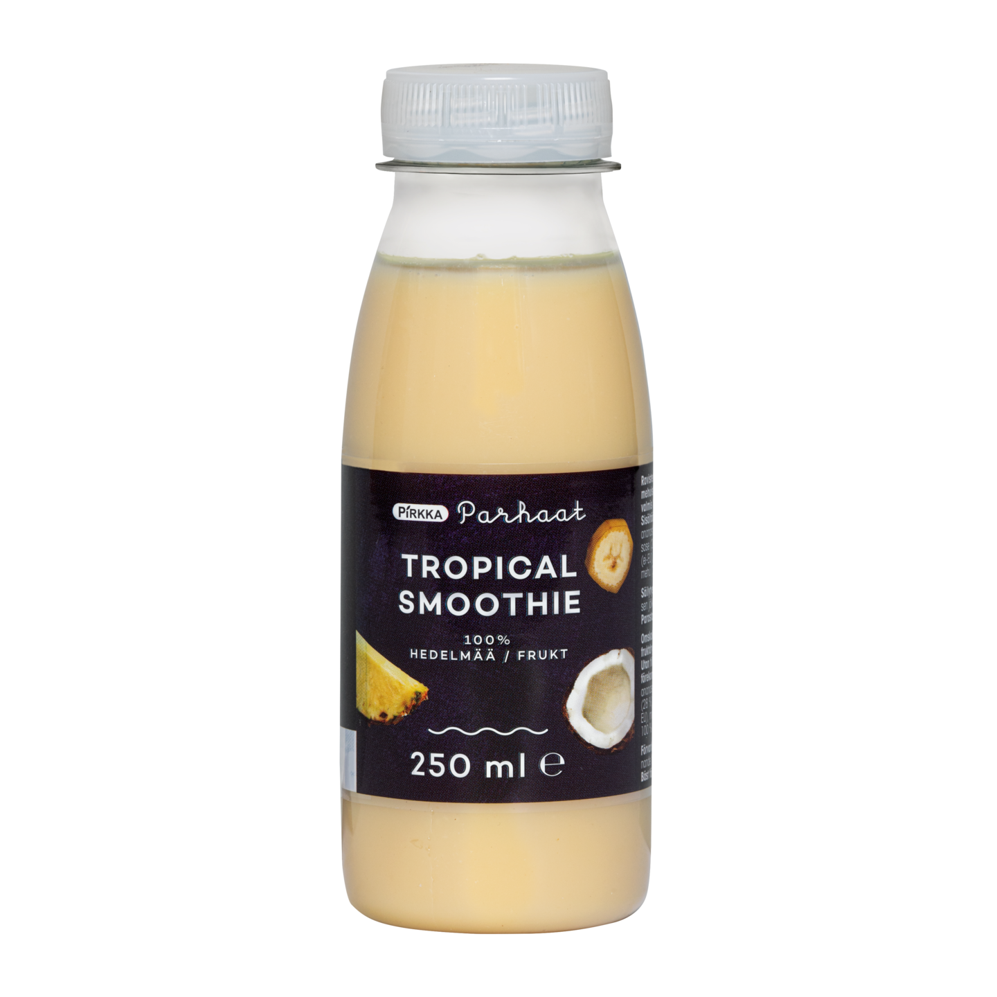 Pirkka Parhaat smoothie on raikkaan hedelmäinen juotava välipala. Smoothie sisältää 100% hedelmää, eikä siihen ole lisätty sokeria. Tässä trooppisessa smoothiessa maistuvat muun muassa ananas, banaani ja kookos. Smoothiet on pakattu pantillisiin muovipulloihin.