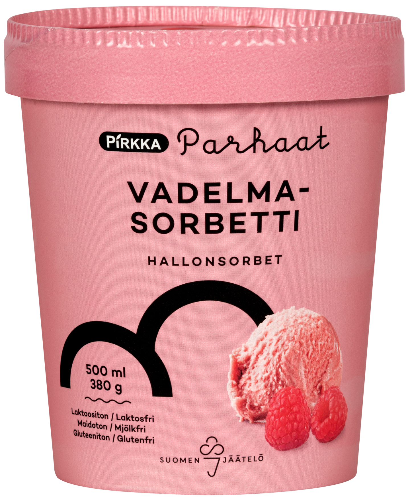 Pirkka Parhaat vadelmasorbetti on raikas ja ihanan vadelmainen jälkiruoka. Sopii erittäin hyvin myös mutakakun kanssa. Suomen Jäätelön valmistamat herkulliset ja laadukkaat artesaanisorbetit sopivat myös vegaaneille.