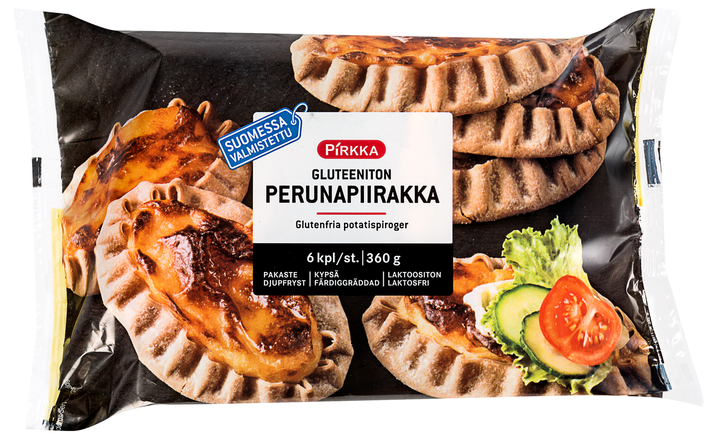 Pirkka gluteeniton perunapiirakka on maukas tarjottava, jonka leivontaan ja viimeistelyyn on käytetty aitoa voita. Piirakan kuori on maukas, ohut ja rapea. Täyte on mehevän perunainen. Piirakat on leivottu Pohjois-Karjalassa. Perunapiirakat ovat kypsiä, joten ne tarvitsee vain lämmittää ennen tarjoilua. Tuote on gluteeniton ja laktoositon.