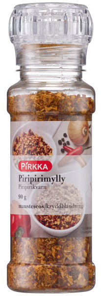 Pirkka piri-pirimylly on uudelleen täytettävä. Paprikainen, sipulinen ja pippurinen mausteseos. Sopii erityisesti liha- ja kanaruokiin. Sopii myös kala- ja kasvisruokiin antamaan lisää mausteisuutta ja tulisuutta.