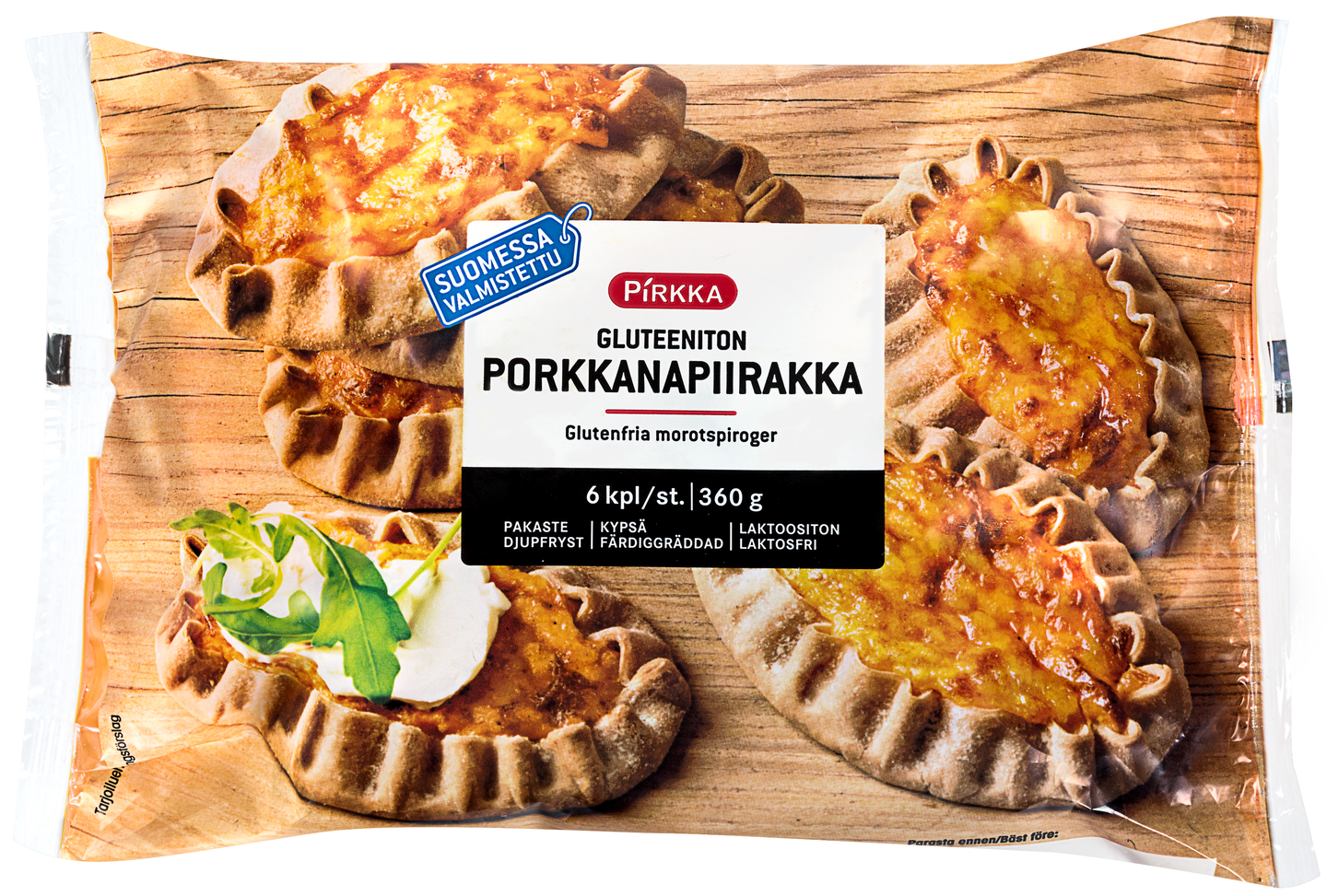 Pirkka gluteeniton porkkanapiirakka on maukas porkkana-riisitäytteinen piirakka, jonka leivontaan ja viimeistelyyn on käytetty aitoa voita. Piirakat on leivottu Pohjois-Karjalassa. Porkkanapiirakat ovat kypsiä, joten ne tarvitsee vain lämmittää ennen tarjoilua. Tuote on gluteeniton ja laktoositon.