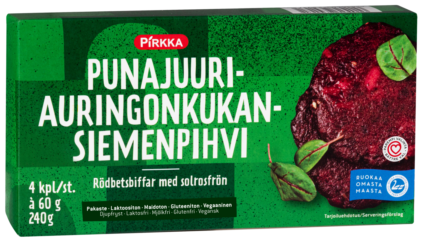 Pirkka punajuuri-auringonkukansiemenpihvit ovat maukkaita ja valmistuvat helposti. Pihvit voi lämmittää pannulla, uunissa tai mikrossa. Tuote on sopii vegaaniseen ruokavalioon ja on gluteeniton, maidoton sekä laktoositon.